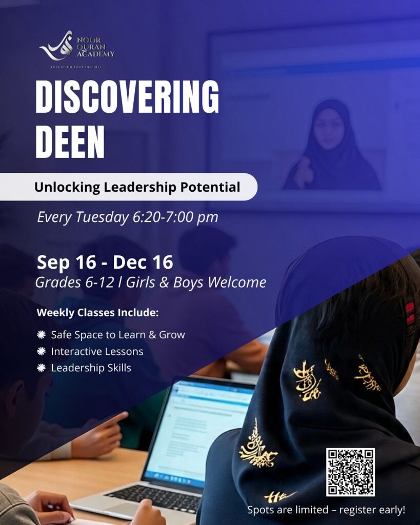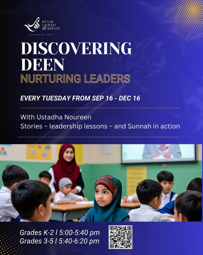 Calling all students to join us for weekly, virtual, engaging Islamic education classes where we’ll explore leadership, strengthen confident Islamic identities, and grow together in a supportive environment.